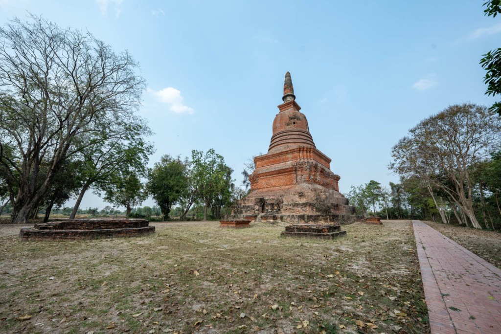 1. เจดีย์ประธานทรงระฆังขนาดใหญ่ก่อด้วยอิฐ ตั้งอยู่บนฐานสูงรูปสี่เหลี่ยม ขนาดกว้างด้านละ 17 เมตร ที่ฐาน ด้านทิศตะวันออกและตะวันตกทำเป็นซุ้มจระนำประดิษฐานพระพุทธรูปประทับนั่ง โดยเฉพาะซุ้มด้านทิศตะวันออกปรากฏ ร่องรอยการก่อเป็นซุ้มโค้งสูงขึ้นไปคล้ายกรวยแหลม
